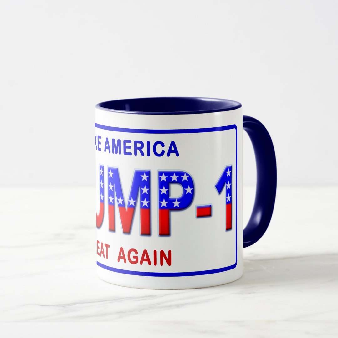 A patriotic Trump – 1 coffee mug inspired by those vintage Chevrolet USA 1 license plates. Show your support for President Donald J. Trump and his America First policies on trade, taxes, energy, regulation, immigration, and healthcare and “Make America Great Again”.